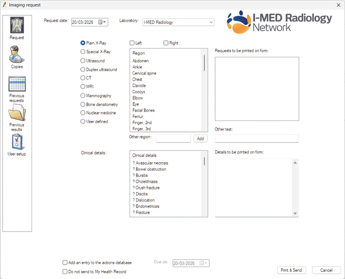 The first, and very important step, is to check that I-MED Radiology is selected in the ‘Laboratory’* drop-down field. If not, it may result in the e-Referral not being sent. *Depending on the software version you are running, this field may also be called 'Provider'.